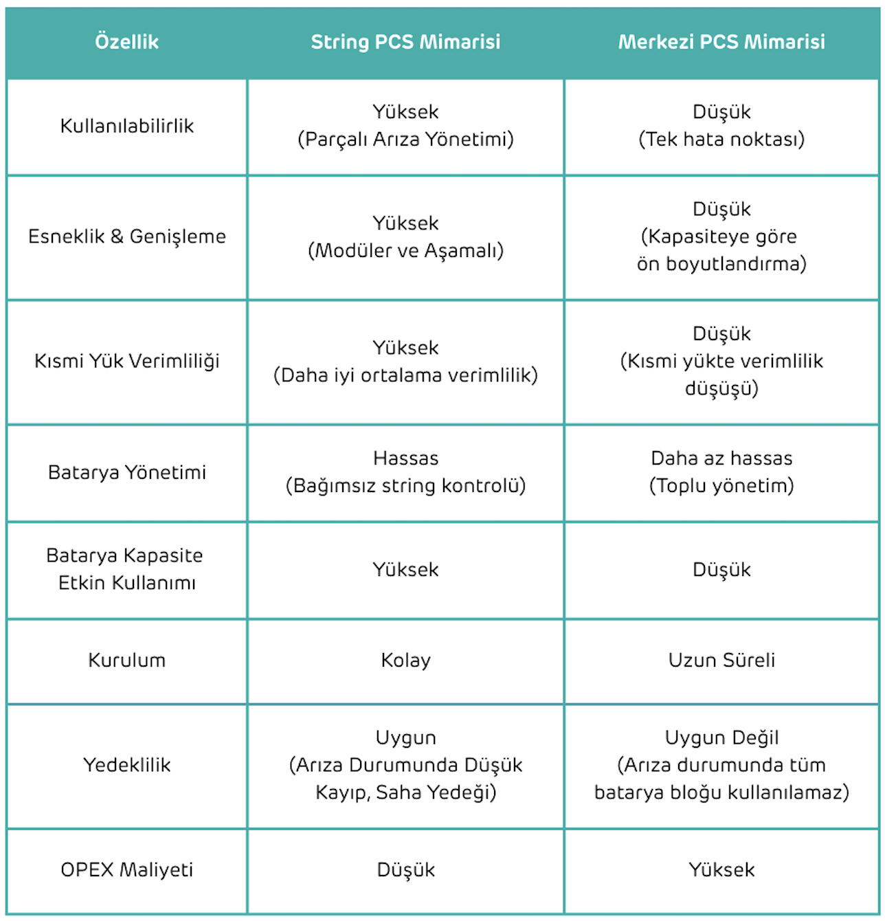Enerji depolama sistemlerinin yaygınlaşmasıyla birlikte, batarya enerjisini şebekeye uygun AC enerjiye çeviren güç dönüşüm sistemlerinin (PCS) mimarisi büyük önem kazanmaktadır. String PCS (Fotovoltaik sistemlerdeki string inverterlere benzer) tabanlı mimariler, merkezi PCS çözümlerine göre operasyonel verimlilik, esneklik ve maliyet açısından önemli üstünlükler sunar.